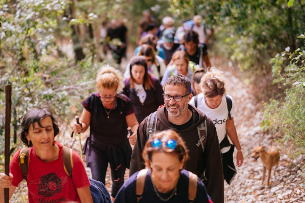Noi Cappuccini a volte guidiamo gruppi di pellegrini lungo il cammino e sono sempre esperienze molto intense che creano un’atmosfera e un’unione speciale tra tutti i partecipanti. Viviamo momenti di silenzio pur camminando insieme nel bosco, condividiamo le nostre vite, ci regaliamo momenti di riflessione, ci aiutiamo nella fatica e ridiamo tanto con allegre cene che coronano la giornata. Tra tutti i bellissimi ricordi che custodisco, ne colgo uno, come i tanti fiori che ciascun pellegrino del gruppo ha raccolto un giorno per omaggiare Mimma, la nostra meravigliosa ospitalera di Pascelupo, che noi chiamiamo “l’angelo dei pellegrini” per le tante attenzioni e delicatezze che riserva loro. Capitò che quel 24 di aprile in cui stavamo arrivando nel suo paese, fosse proprio il giorno del suo compleanno. Ognuno dei trenta pellegrini giunse da lei con in mano il più bel fiore che aveva trovato lungo il cammino, e glielo offrì come regalo genuino, stringendosi a lei in cerchio e cantandole buon compleanno. Un momento speciale fatto di un gesto semplice che è rimasto nel cuore di tutti.