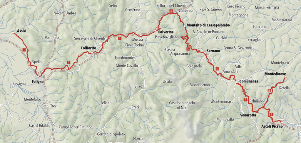 Questo percorso da Assisi ad Ascoli Piceno è lungo 167 km.