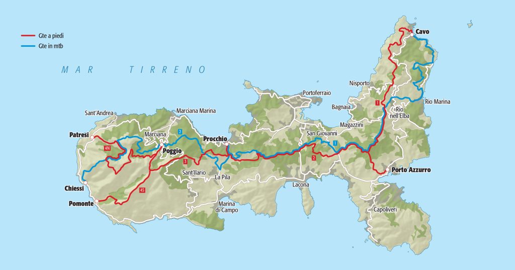 Tutta la Gte è contrassegnata dalla segnaletica standard Cai: orizzontale (segnavia bianco-rossi e segnavia “a bandierina” rosso-biancorosso con scritta “GTE”) e verticale (tabelle segnavia a freccia biancorossa, con mete ravvicinate, intermedie e finali e i tempi orientativi di percorrenza). Lungo il percorso ci sono inoltre numerosi pannelli informativi, recentemente aggiornati, e alcune indicazioni ulteriori. L’itinerario è generalmente ben segnato, anche se è sempre necessario prestare attenzione a dove si sta andando, soprattutto nella parte centrale dove più fitti sono gli incroci delle strade sterrate; inoltre in alcuni punti, come ad esempio su alcuni tratti fra le pietre granitiche del monte Capanne, la segnaletica può essere meno frequente o più difficile da individuare a causa delle caratteristiche del terreno. La Gte in mtb invece non è segnalata: di conseguenza per percorrerla sono indispensabili questa guida e le tracce Gps (vedi il paragrafo seguente).