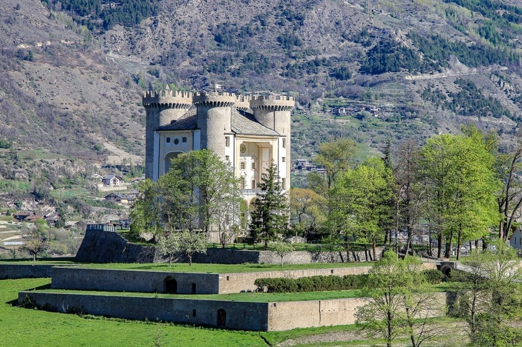 In cammino verso Aymavilles, si possono ammirare le quattro alte torri circolari del Castello, la cui struttura difensiva subì molte modifiche e quella più sostanziale venne fatta nel 1730 da Giuseppe Felice di Challant, che inserì ampi loggiati sulle facciate e abbellì gli interni, dando all’edificio un aspetto meno militare e più simile a quello di un’imponente dimora barocca.