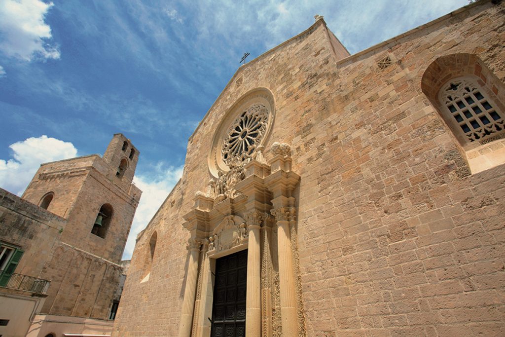 La Finis terrae d’Italia era anticamente chiamata Leuca (dal greco leukos, bianco) per il colore di cui si tingevano gli scogli con l’infrangersi delle onde. L’aggiunta Santa Maria si deve alla presenza del santuario: consacrato secondo la tradizione da san Pietro, fu costruito al di sopra del precedente tempio della dea Minerva, di cui si conserva l’ara sacrificale. L’attuale SANTUARIO DI SANTA MARIA DE FINIBUS TERRAE è una struttura fortificata che risale alla metà del XVIII secolo, dopo l’ennesima distruzione a opera dei turchi; dei precedenti edifici resta solo il portale cinquecentesco; la colonna mariana al centro della piazza fu eretta invece a fine Seicento. Di certo lo sguardo sarà attratto però dal faro, costruito nel XIX secolo, che con i suoi 47 m è il secondo più alto d’Europa, dopo quello di Genova; affrontando una scala a chiocciola di 254 scalini si può anche salire fino alla terrazza da cui si gode una vista incredibile. Da notare infine la cascata monumentale dell’Acquedotto Pugliese che lega il santuario con il porto e la città.