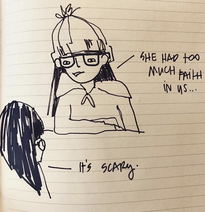 Le sue parole sono rimaste impresse nella mia memoria, perché erano così controintuitive, rispetto al modo in cui vivevo la mia vita. Avevo trascorso tutta la mia infanzia pensando che gli aspetti strani del mio carattere non erano altro che difetti, da silenziare, nascondere, mimetizzare. Ho deciso di mettere alla prova questa teoria, smettere di censurare i miei pensieri bizzarri, e anzi farli emergere. Il giorno seguente, ho ritratto Beatrice per la prima volta. Ero in libreria con i miei bambini, quando si è lasciata cadere dal pavimento, a testa in giù, con le sue tipiche movenze ninja.