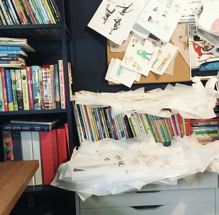 I disegni mi piace realizzarli in un piccolo studio ricavato nella mia abitazione. Amo quello che ho intorno: pareti scure, in contrasto con la luce e il colore dei libri sugli scaffali.