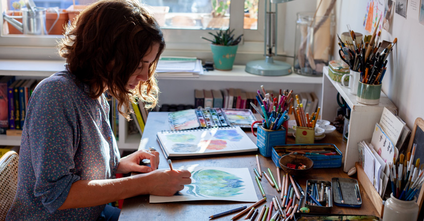 Ci ho lavorato per i primi 5 mesi del 2020. Gran parte delle tavole definitive sono state realizzate nel periodo di lockdown. Mi sono ritrovata in sintonia con il polpo in cattività, senza poter uscire di casa per due mesi. é stato un lavoro molto sofferto per via del tempo frammentato con mia figlia a casa, e per lo stato psicologico in cui ci trovavamo tutti in quel periodo. Come tecnica ho usato acquarello, gouache e matite colorate. Prima di cominciare ho guardato documentari e video sui polipi, soprattutto sulle loro abilità sorprendenti nel risolvere problemi e trovare punti di fuga da situazioni di cattività. ho fatto molti studi e bozzetti per poi trovare la versione stilizzata che vediamo nel libro.