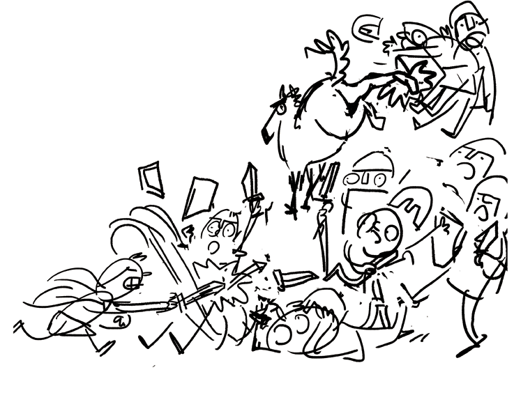 Successivamente, verifico se Matthieu mi ha lasciato degli indizi nel testo (ad esempio, il colore dei capelli, segni particolari, l’equipaggiamento…). Poi, comincio a disegnare un sacco di personaggetti in tutti i modi possibili: grandi, piccoli, con il naso a punta, rotondo, quadrato, con gli occhi grandi o piccoli, i capelli neri, biondi, grigi…