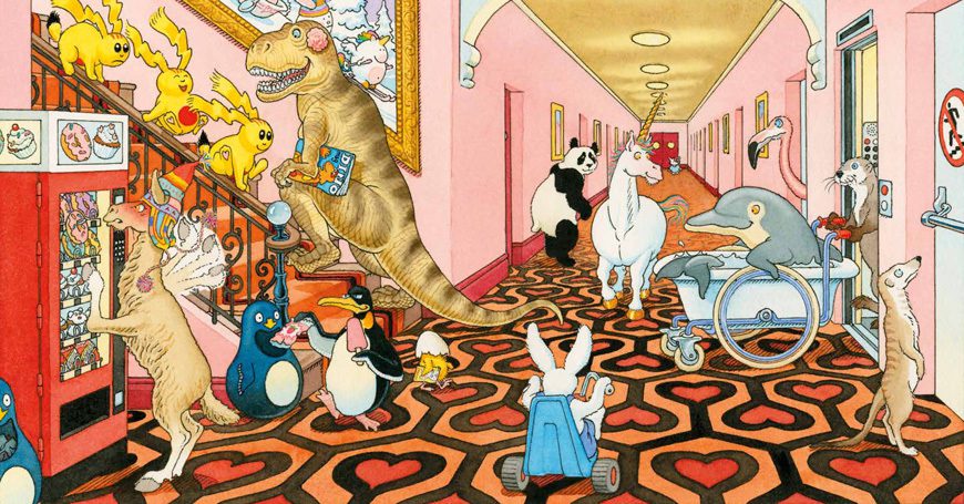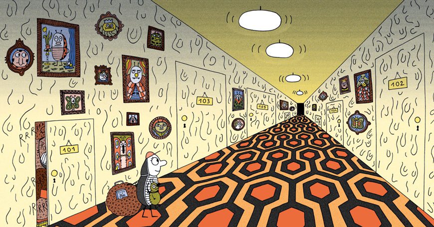 Altra curiosità: Claire Schvartz in Insect Hotel, ma anche Gilles Bachelet in Una vacanza da unicorni (altro albo ricchissimo di interni strepitosi!), citano l’ambientazione un famoso film nelle loro tavole: si tratta di “Shining”, diretto da Stanley Kubrik!