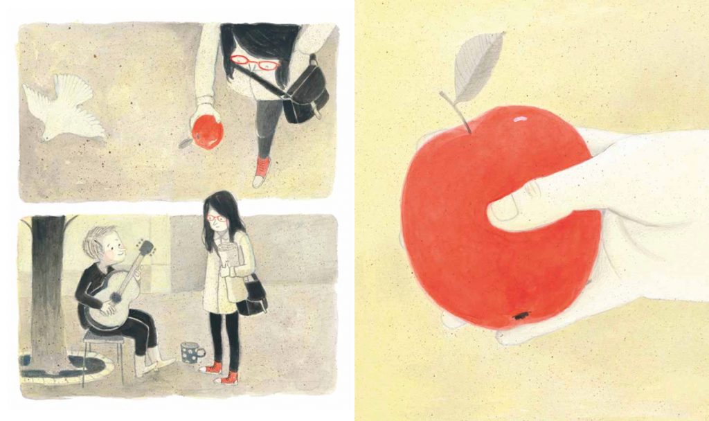 Sono le 7 di mattina, una ragazza si sveglia tutta triste perché ha perso il suo cane. Inforca gli occhiali, fa colazione e, armata di scotch e puntine, esce per tappezzare la città con i volantini nella speranza di ritrovarlo. Camminando per strada incontra un suonatore di chitarra dall’aria affamata. Così, la ragazza dagli occhiali rossi, non ci pensa su due volte e gli regala la mela che si è portata da casa.
