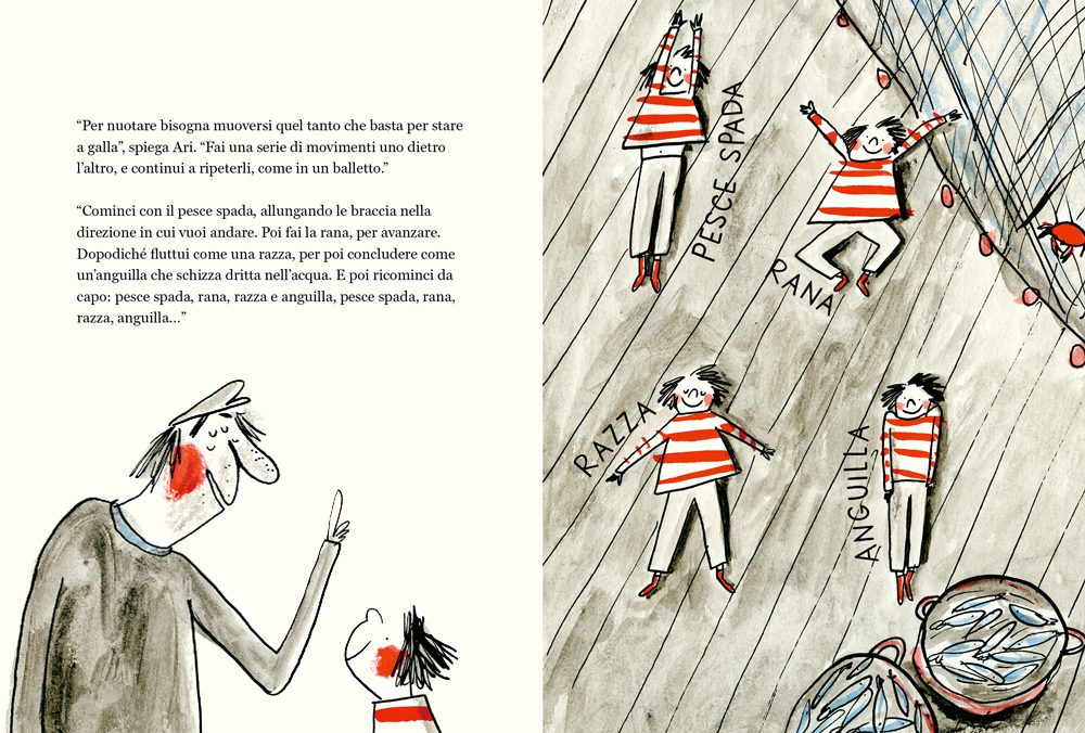 Kaat vuole imparare a nuotare, e da questo desiderio nasce un percorso fatto di tentativi, esercizi buffi, allenamento e ostinazione. I suoi maestri sono marinai impacciati, ma profondamente umani. Non le dicono che sarà facile, perché non lo è, ma la accompagnano, la sostengono, credono in lei anche quando lei non ci riesce. Mi sono venute in mente le parole di Daniela Lucangeli: