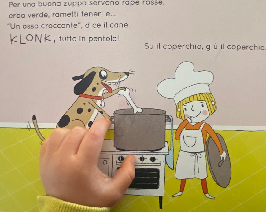Nella zuppa cosa c’è? porta i bambini a raccontare i loro gusti e quello che vivono tutti i giorni nel momento del pasto. E non solo… la presenza degli animali arricchisce infatti l’esperienza della lettura con suoni onomatopeici, che emergono in modo corale, proprio nel momento della comparsa sulla pagina di uno o dell’altro animaletto!