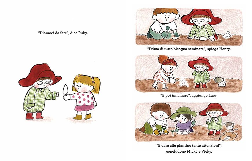 Nello sfoglio c’è una doppia pagina in cui vedo rappresentato in modo mirabile il senso della valutazione, per noi insegnanti: condividendo gli strumenti per coltivare un seme, ogni bambina e bambino può imparare ad averne cura in autonomia. Ci vorrà e tempo e cura, ma poi sboccerà uno splendido girasole, e sarà solo l’inizio di un percorso di apprendimento ricco e fecondo.