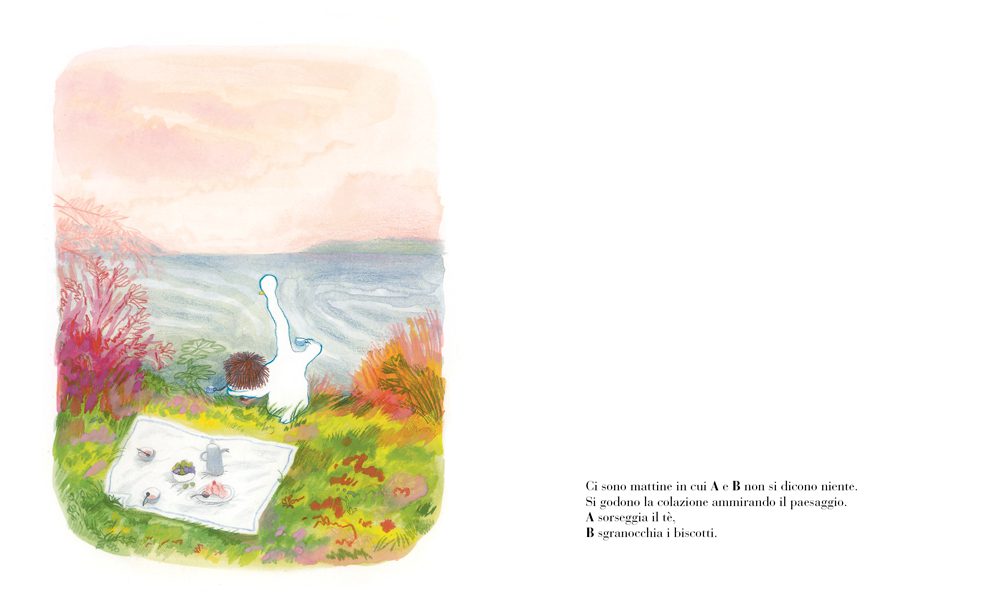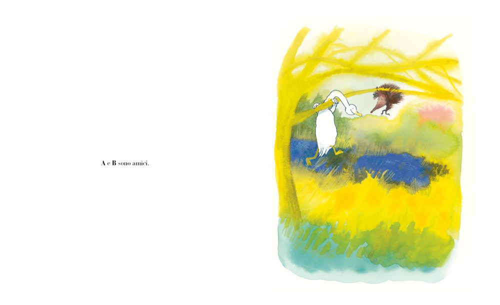 A e B. Due lettere per identificare i protagonisti – un riccio e un’oca – sottolineando la loro dimensione universale. Le relazioni non hanno bisogno di etichette. A e B possono essere amici, amiche, compagni, anime affini.