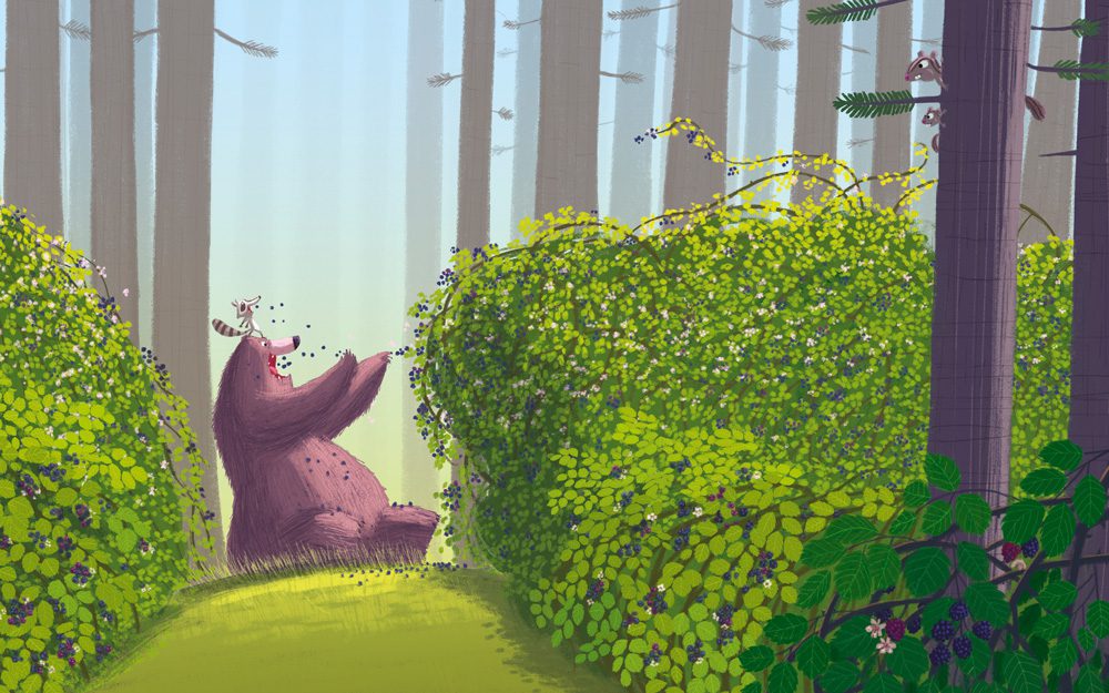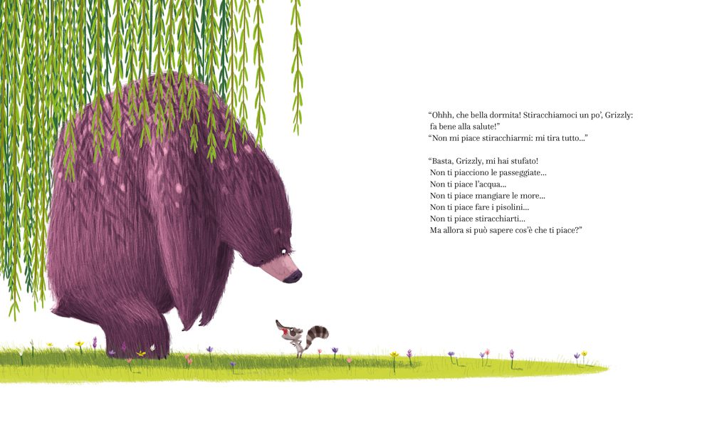 A ogni proposta dell’orsetto lavatore, il grosso orso imbronciato trova il modo di lamentarsi: la passeggiata è troppo lunga, l’acqua dello stagno è troppo bagnata, a raccogliere le more ci si punge… Eppure, dopo il solito grugnito, Grizzly alla fine fa compagnia a Procione, e sembra anche contento. Come mai? Perché l’unica cosa che gli piace davvero è stare col suo amico!