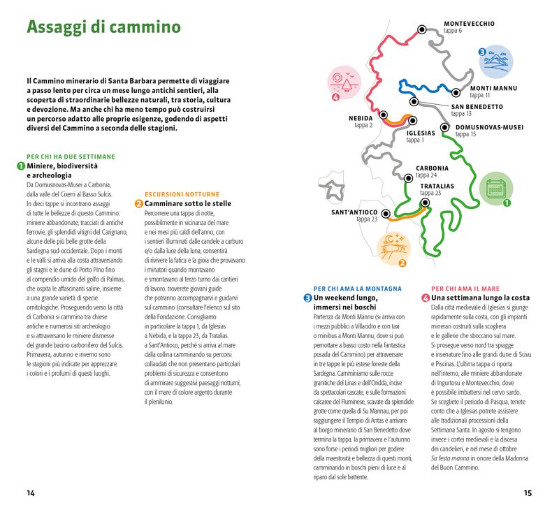 Dal mare cristallino di Sant’Antioco alle fitte foreste del Marganai, dalle bianche dune di Piscinas alle spettacolari grotte di Is Zuddas, un viaggio indimenticabile alla scoperta della Sardegna sud-occidentale, tra suggestive miniere dismesse, gallerie affacciate sugli scogli, villaggi fantasma e antiche ferrovie che si perdono nei boschi. Fil rouge devozionale è il culto di santa Barbara, patrona dei minatori, le cui chiese punteggiano questo splendido itinerario storico e naturalistico. Un itinerario ad anello che da Iglesias si snoda lungo le piste e i sentieri battuti dai minatori nel corso di 8.000 anni di storia, dal Neolitico al Novecento. Con tutte le informazioni utili: quando partire, cosa portare, le mappe, le altimetrie, i dislivelli, la descrizione del percorso, dove dormire, i luoghi da visitare. E, inoltre, le storie e le testimonianze di chi ha lavorato in miniera.
