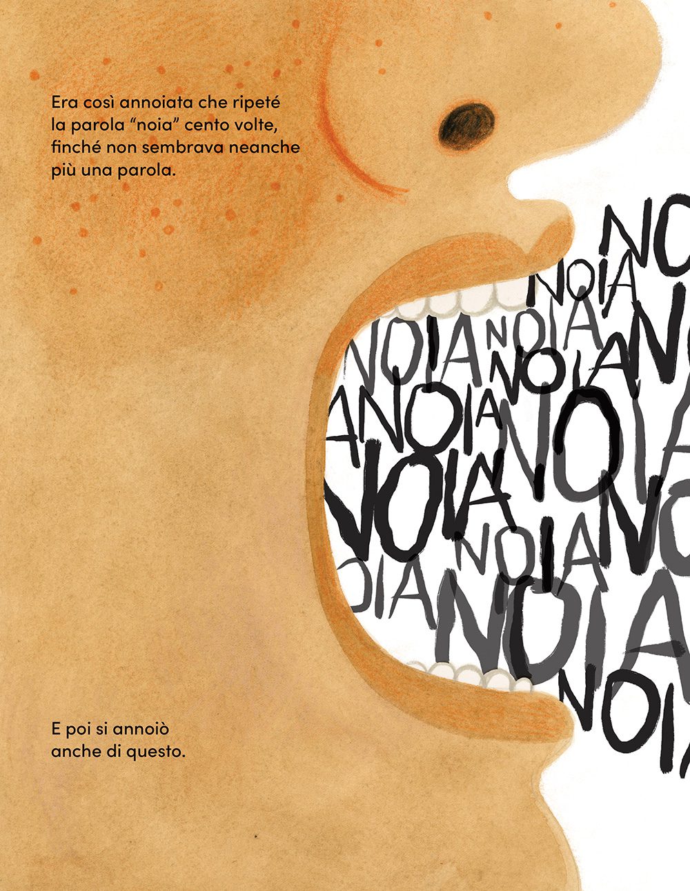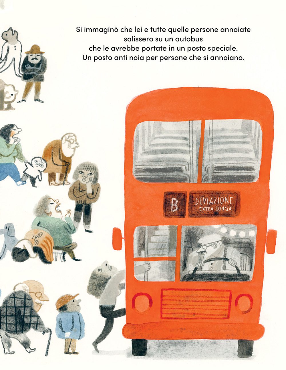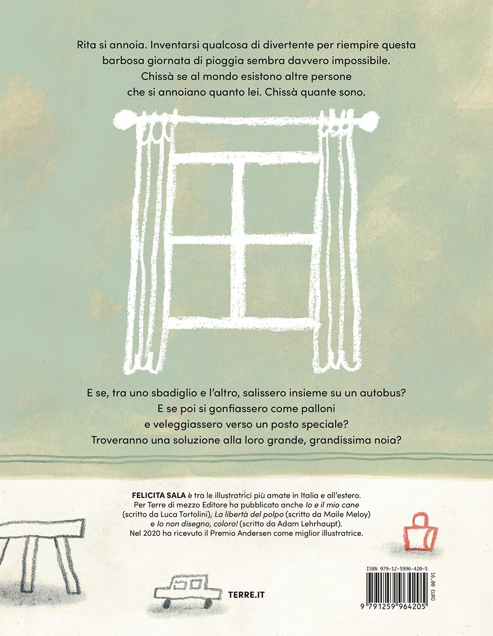 Rita si annoia. Inventarsi qualcosa di divertente per riempire questa barbosa giornata di pioggia sembra davvero impossibile. Chissà se al mondo esistono altre persone che si annoiano quanto lei. E se, tra uno sbadiglio e l’altro, salissero insieme su un autobus? E se poi si gonfiassero come palloni e veleggiassero verso un posto speciale? Su quell’isola, tre nonnine fondano una band, una studentessa parla con le balene, due gemelli viaggiano nello spazio-tempo… E Rita? É ormai impegnatissima con le sue fantasie, quando la mamma la chiama per cena!