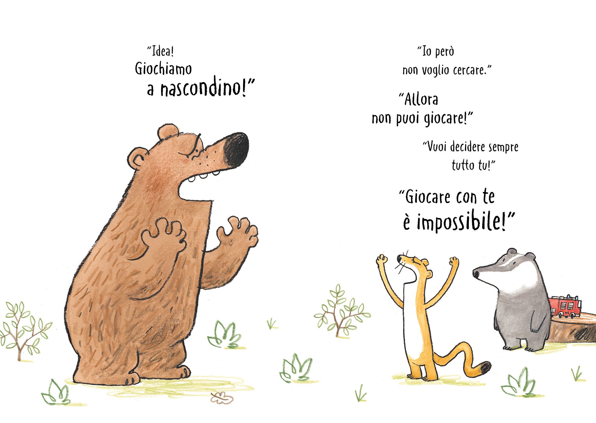 “Vuoi decidere sempre tu!” dice la Donnola. “E tu vuoi sempre vincere!” dice l’Orso. E a un certo punto il Tasso deve tornare a casa…