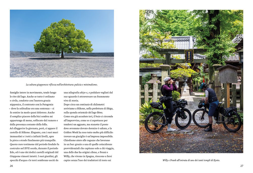 Kyoto come punto di partenza, Tokyo come meta. 800 km in bici alla scoperta di villaggi dimenticati dal tempo, antiche fonti termali, metropoli sconfinate che accolgono al tramonto in una galassia di luci. Un viaggio in una terra remota e ospitale, sospesa con grazia fra la modernità e il sogno.