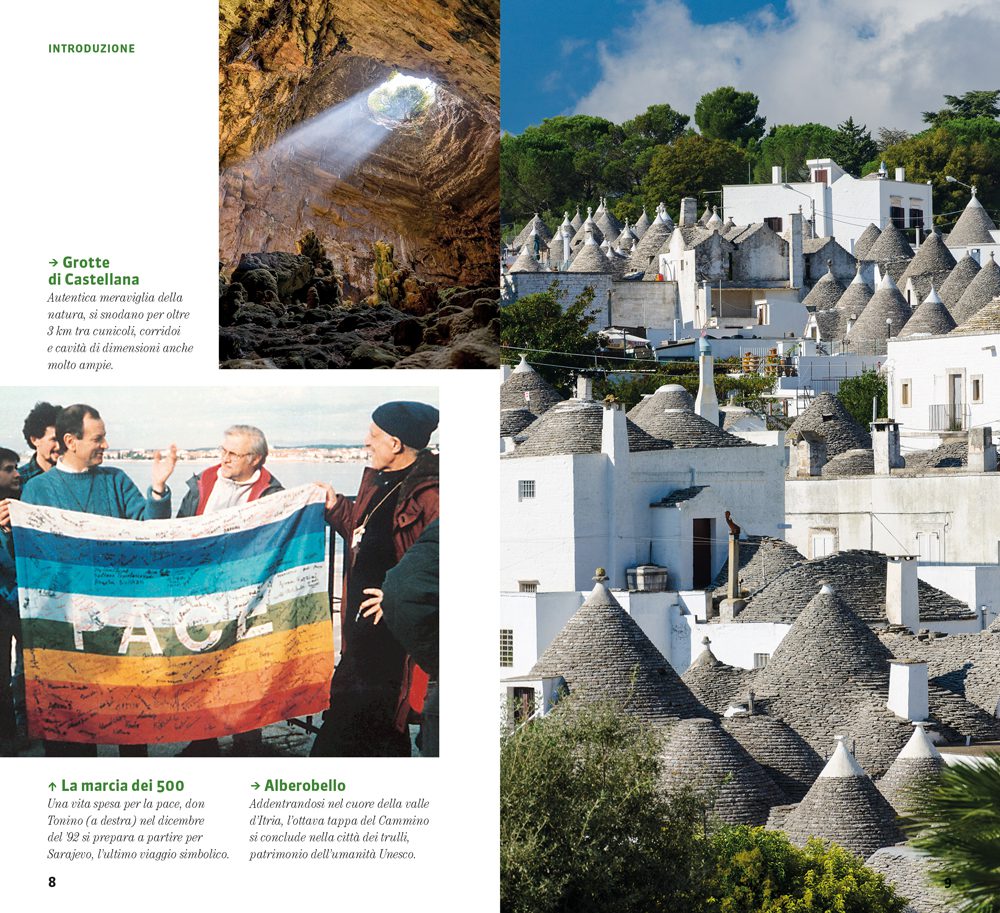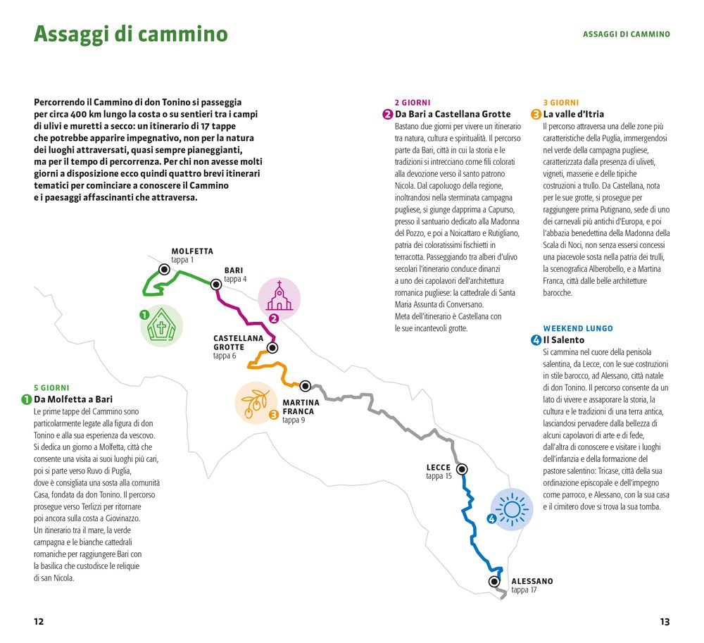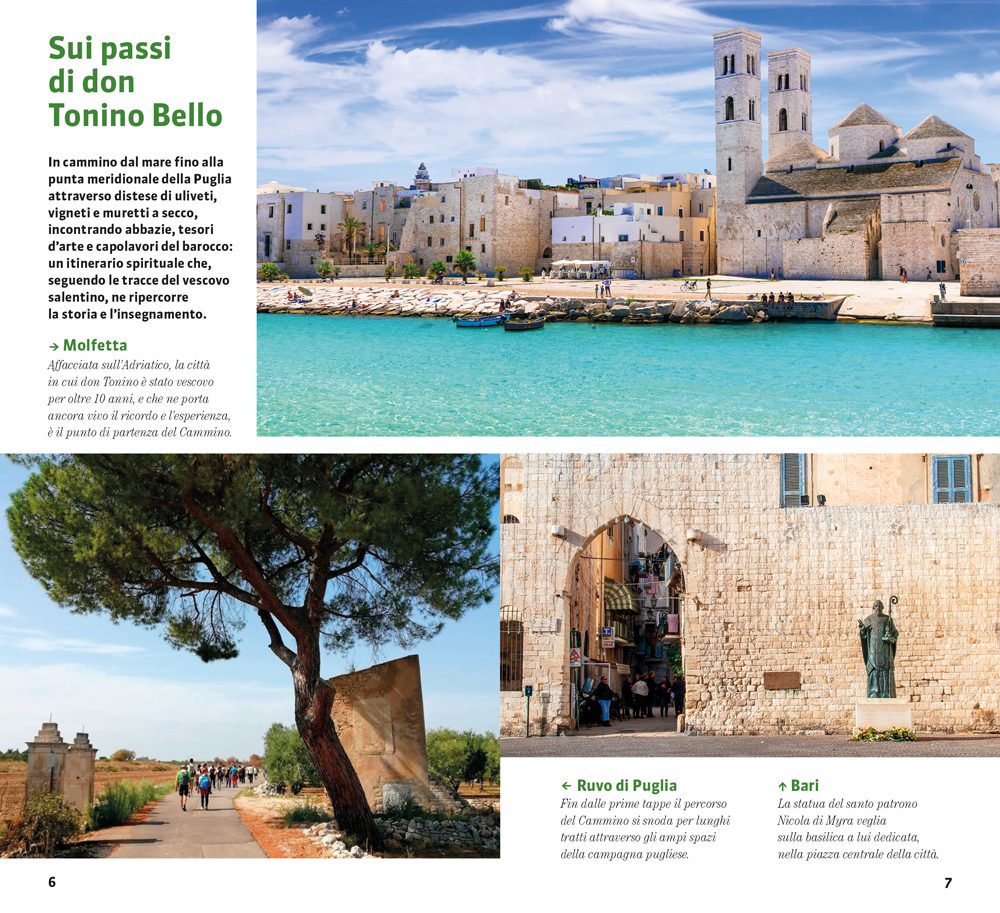 Nella guida ci accompagnano giorno per giorno alcuni dei brani più significativi di Tonino Bello per un viaggio fisico e spirituale sulle sue tracce in attesa che, dopo l’elezione a “venerabile” nel 2021 da parte di papa Francesco, venga nominato beato.