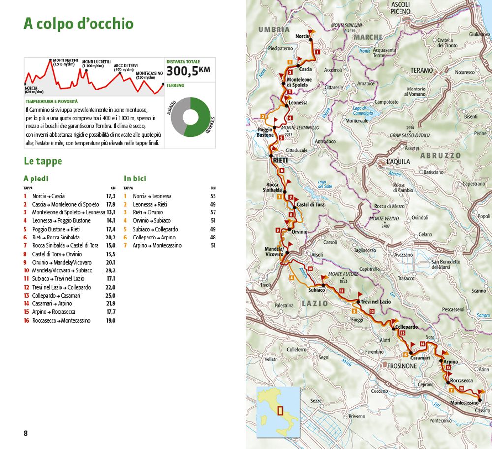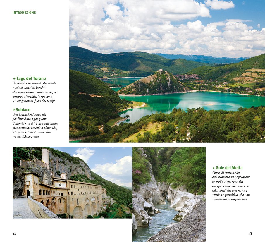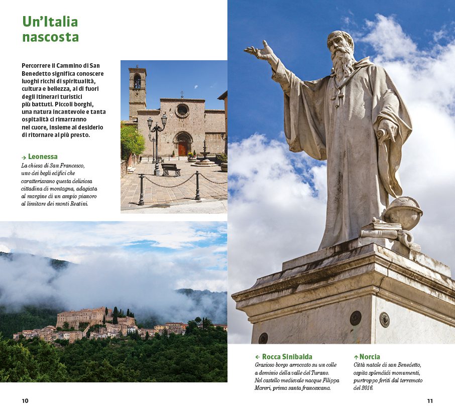 A piedi o in bicicletta lungo un itinerario unico, in Umbria e Lazio, sulle tracce di san Benedetto, toccando le tre località più significative nella vita del santo: Norcia, dove nacque; Subiaco, dove pose le basi della sua Regola; e Montecassino, dove fondò l’abbazia che ha saputo resistere e rinascere nonostante quattro distruzioni. Sedici tappe su antiche vie di transumanza e sentieri, alla scoperta di un’Italia fatta di splendide valli punteggiate di rocche, castelli medievali e paesi abbarbicati sui colli.