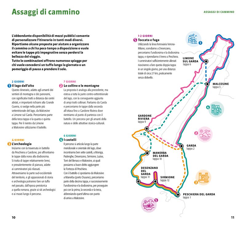 Un’esperienza di trekking adatto a camminatori esperti e non, tra Lombardia, Trentino-Alto Adige e Veneto. Un percorso ad anello che riporta in vita la ricca rete sentieristica del territorio collegando i panorami della rocca di Garda, i profumi delle antiche limonaie affacciate sul lago e piccoli borghi pieni di vita. Un itinerario completamente personalizzabile, con la possibilità di iniziare da ogni punto tappa.