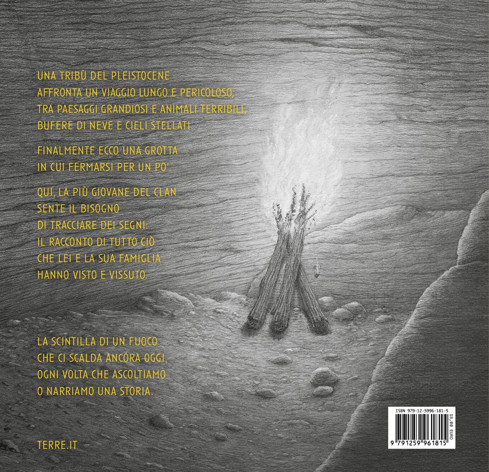 Un silent book dalle illustrazioni maestose, che ci catapulta ai tempi in cui eravamo fragili creature in balia di una natura grandiosa e terribile. Un inno al potere della narrazione: quella scintilla che ci scalda ancora oggi, ogni volta che ascoltiamo o raccontiamo una storia.