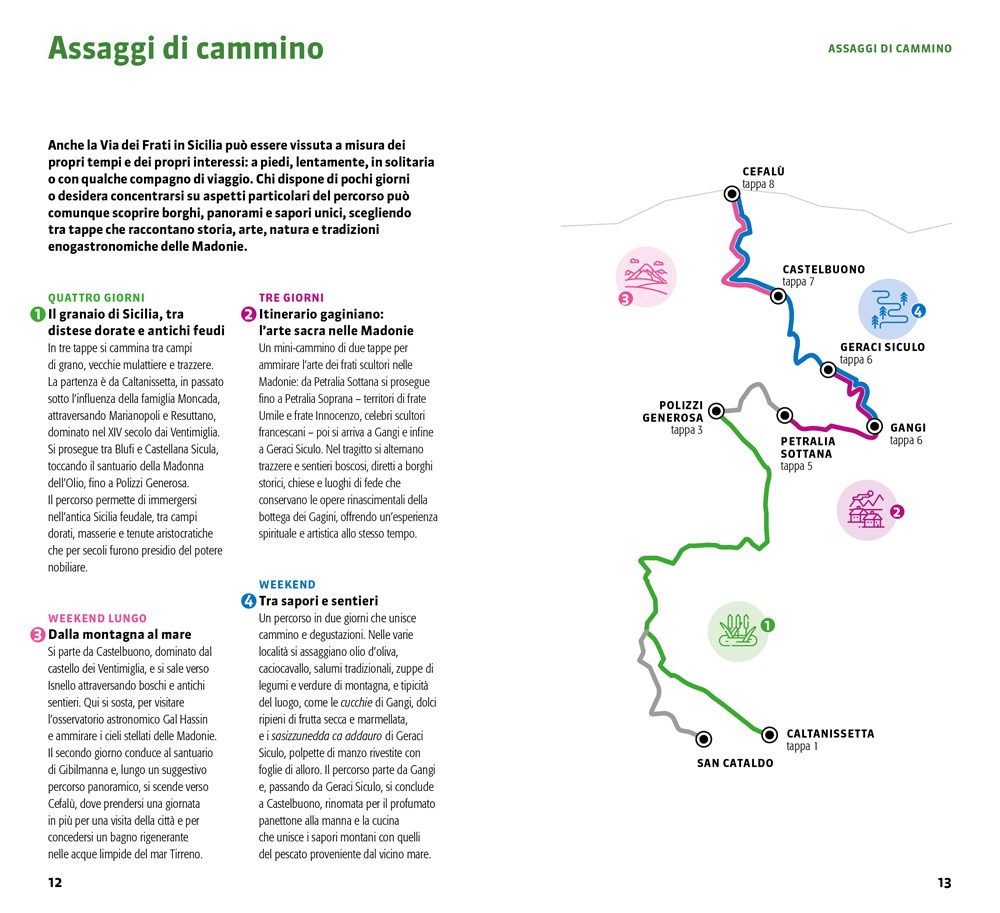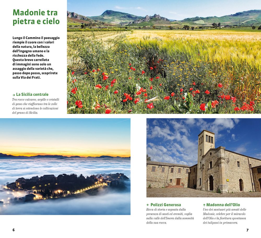 Un cammino tutto da scoprire, che dal cuore della Sicilia porta fino al mare. Otto tappe lungo le strade tracciate per secoli dai monaci di cerca, seguaci di san Francesco e autentici testimoni di fede. Ad accompagnarci in quest’isola che sorprende a ogni passo, le vette delle Madonie, così verdi che ricordano le Alpi, il calore della gente e luoghi di pellegrinaggio come il santuario di Gibilmanna. Fino alla Rocca e alla cattedrale normanna di Cefalù, dove la fatica è ripagata dalle acque limpide.