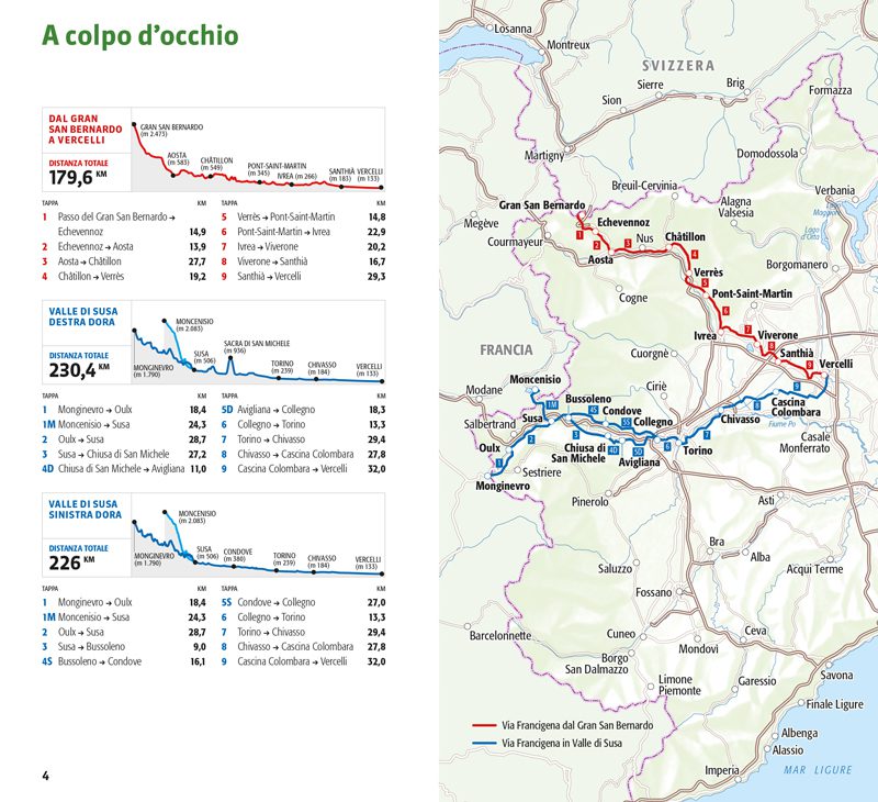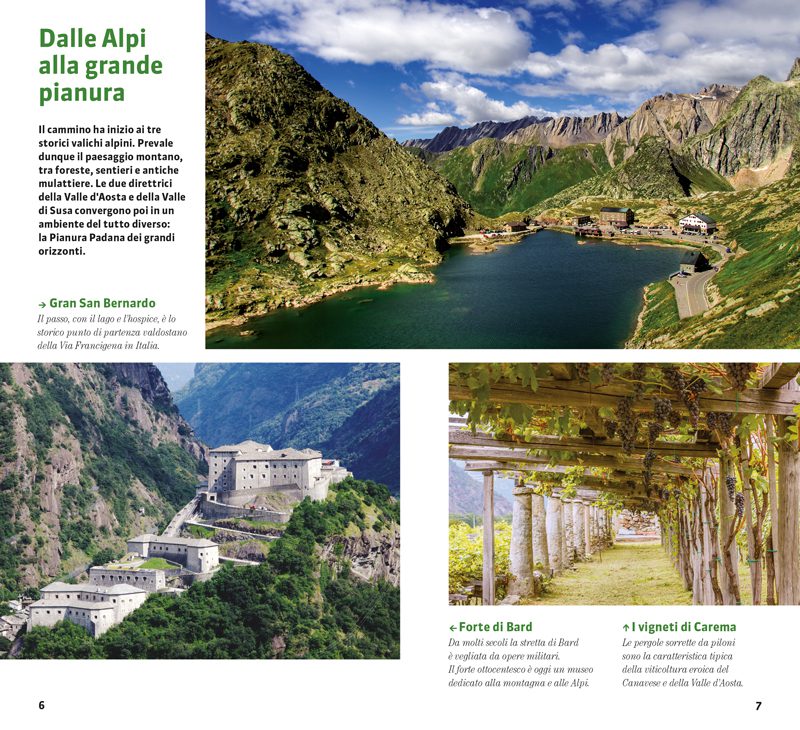 I primi passi italiani della Francigena muovono da tre valichi – Gran San Bernardo, Monginevro e Moncenisio – per proseguire in Valle d’Aosta o in Valle di Susa, sui due versanti della Dora Riparia. Lungo antichi sentieri e strade romane si scende fino ai vasti orizzonti della pianura tra imponenti fortificazioni, da Bard a Exilles, e abbazie medievali come Novalesa e la Sacra di San Michele. Un fascio di itinerari diversi tra cui scegliere, che si riuniscono a Vercelli, centro di diffusione della prima cristianità.