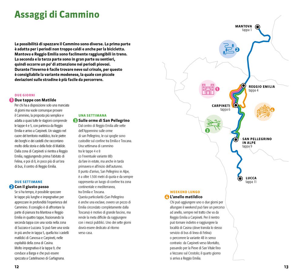 Un Cammino dalle atmosfere medievali che tocca i luoghi della potente feudataria Matilde: Mantova e Canossa, fino alle pievi toscane e al Crocifisso del Volto Santo di Lucca, tra le reliquie più venerate nel Medioevo. Sono 11 tappe per un paesaggio che non annoia mai: durante il percorso, la bellezza delle città d’arte lungo il Po lascia spazio alle montagne del Parco nazionale dell’Appennino Tosco-Emiliano e infine alle dolci colline della Garfagnana. Arrivati a Lucca, si può proseguire sulla Via Francigena. Un itinerario sulle tracce di una delle figure femminili più importanti del Medioevo. Per chi ama l’Appennino, ma anche la storia e la cultura.