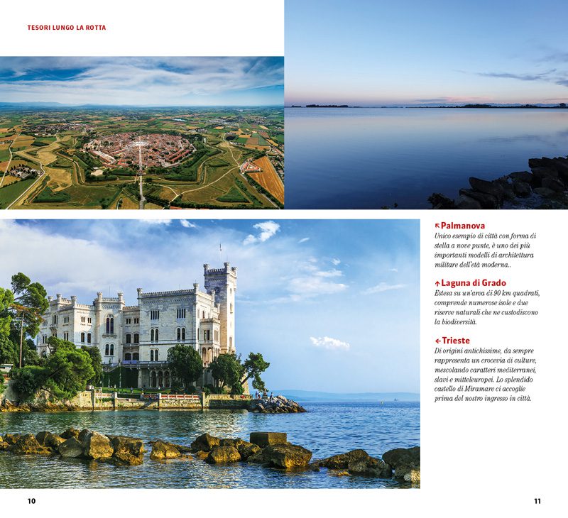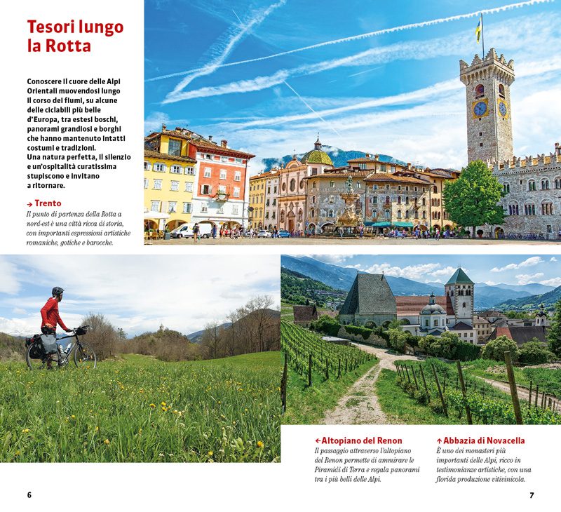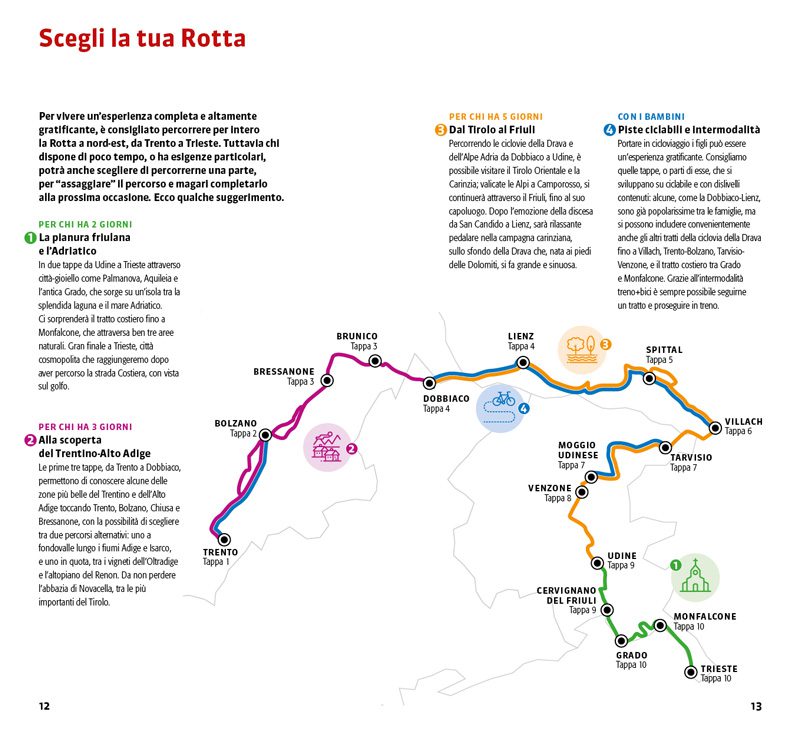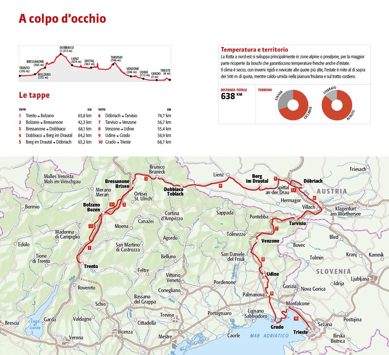 Da Trento a Trieste nello splendore delle terre di confine con lo sguardo alle Dolomiti maestose, toccando l’altopiano del Renon e della Carinzia, l’architettura geometrica di Palmanova e la laguna di Grado, e fermando i pedali a un passo dal mare dove poter ammirare il castello di Miramare a Trieste.