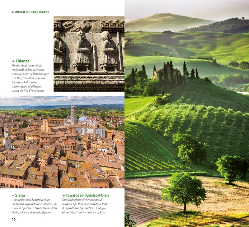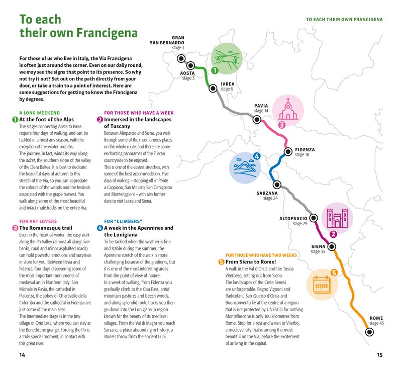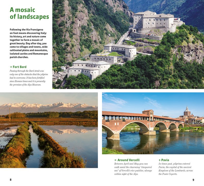 45 stages in Valle d’Aosta, Piedmont, Lombardy, Emilia-Romagna, Liguria, Tuscany and Lazio. With all the essential information to get walking: detailed maps, altimetries, the description of the route step-by-step, the official alternative routes, where to stay the night and places to visit.