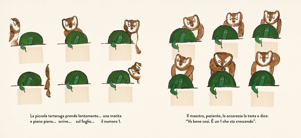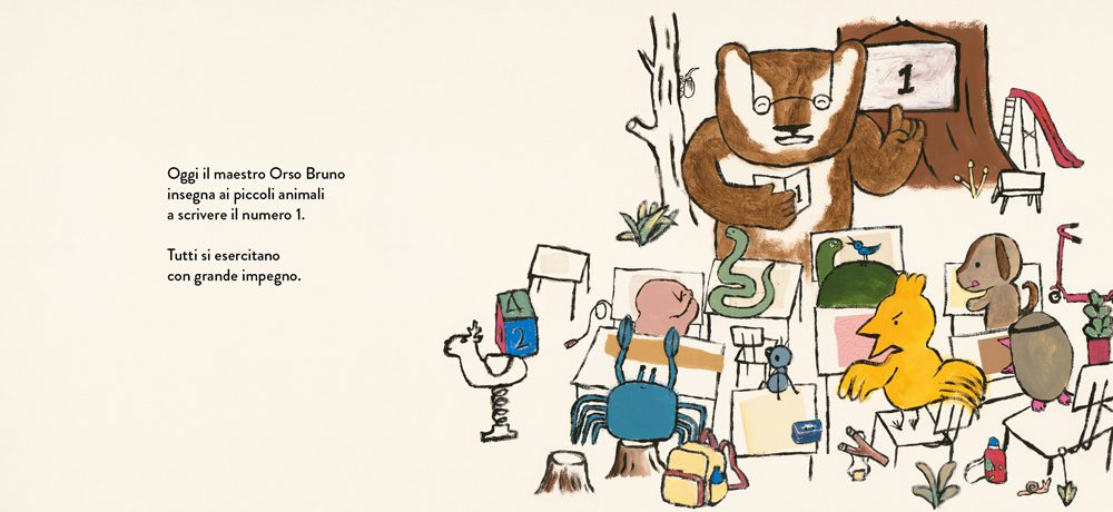 Tutti stanno imparando a scrivere il numero 1, ma ognuno ci prova a modo suo: Granchio lo disegna orizzontale, Formica lo traccia piccolissimo, Cane lo abbozza a forma di osso. Il maestro Orso Bruno non corregge, ma accoglie ogni tentativo, incoraggia l’originalità e trasforma le differenze in risorsa condivisa.