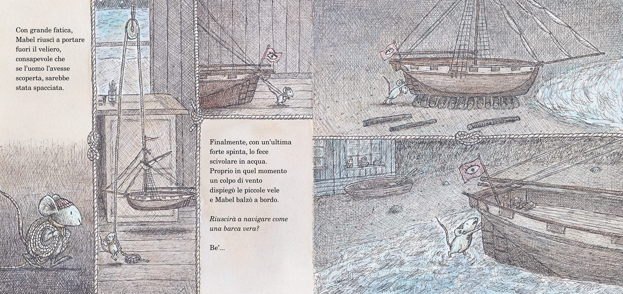 Con lei abitano un ragazzo e un uomo, che ha costruito con grande cura il modellino di un veliero: è il suo oggetto più prezioso e non permette neanche al ragazzo di toccarlo. Mabel non riesce a staccare gli occhi da quella meraviglia. “Riuscirà a navigare come una barca vera?” si domanda, ma non osa portarla in acqua. Finché una folata di vento la spinge all’azione…